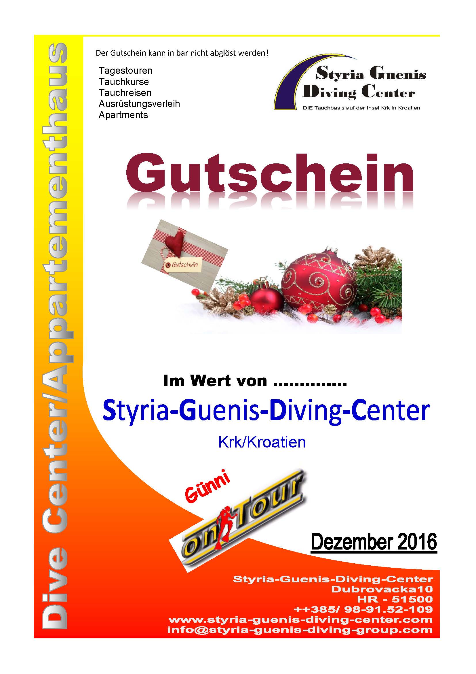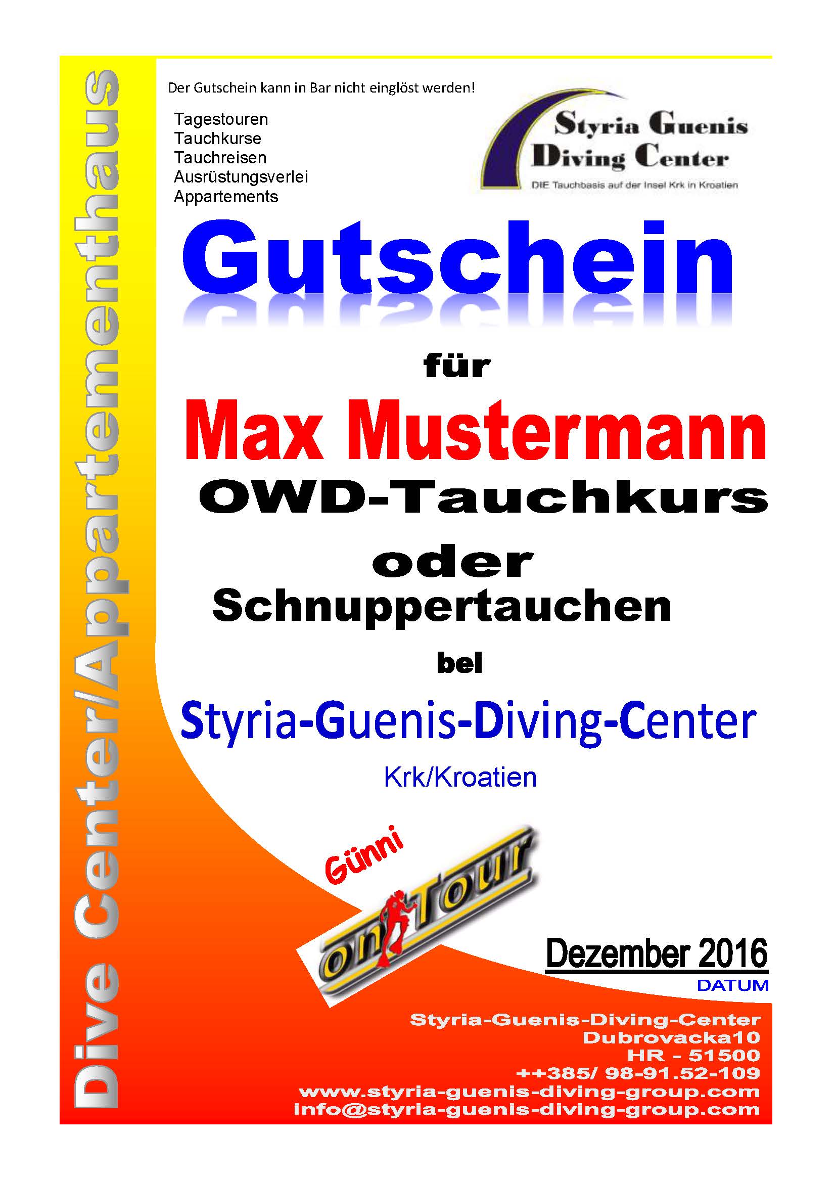 Wir bieten euch die Möglichkeit, aus mehreren verschiedenen Arten von Gutscheinen zu wählen. Es liegt bei euch wofür ihr euch entscheidet. Styria Guenis Diving Center