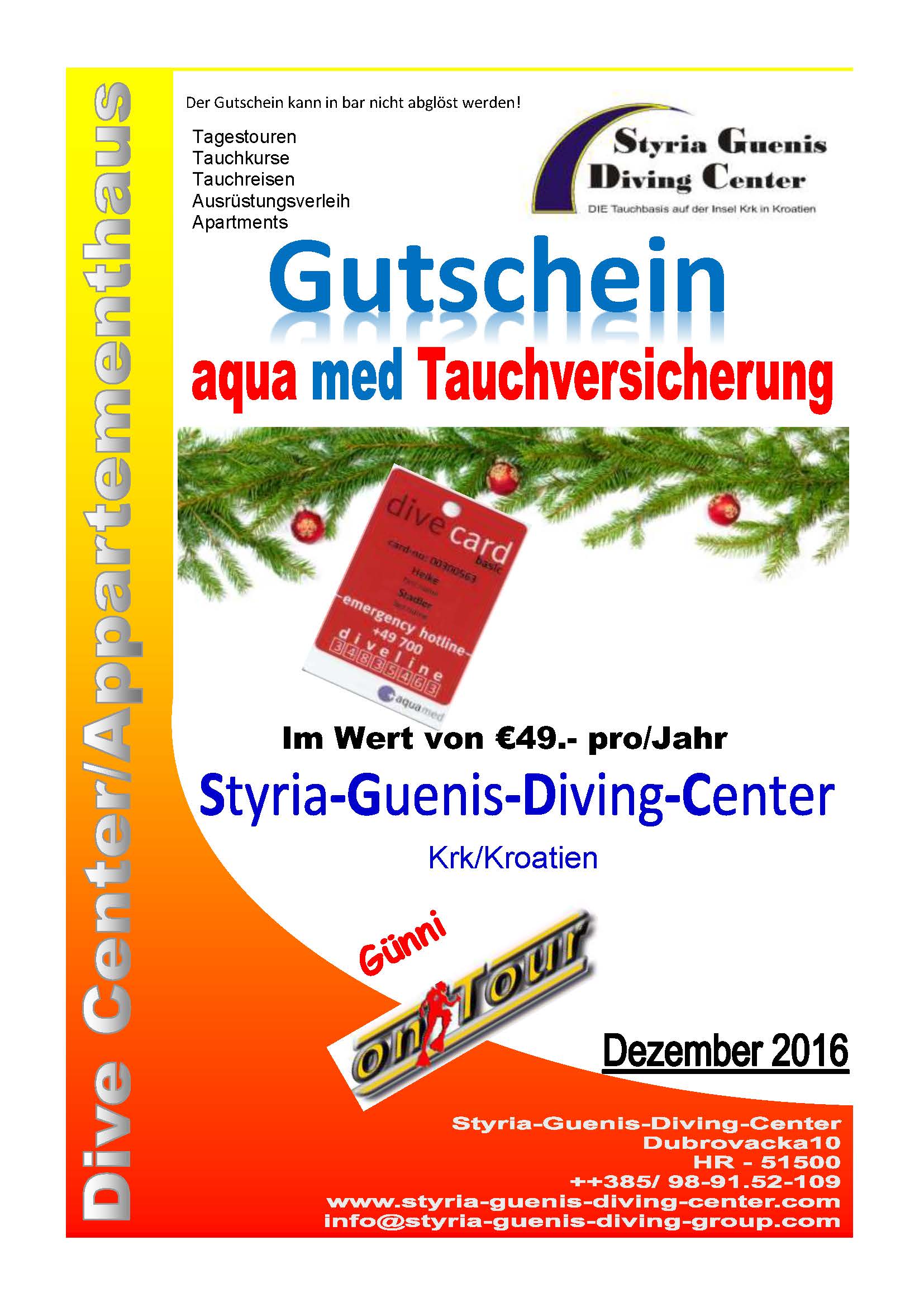Ob jetzt ein Gutschein für Schnuppertauchen, einen Kurs, ob OWD, AOWD, usw. welcher Art auch immer, ist natürlich auch zu wählen, oder einfach ein Gutschein mit einem gewissen Geldwert, bei dem der Beschenkte dann selber wählen kann was er damit bei uns aussucht, ein paar Übernächtigungen bei uns im Apartmenthaus oder Equipment, Gutscheine für Tagestouren oder Landtauchgängen bleibt euren Wünschen überlassen. Setzt euch einfach mit uns in Verbindung wir helfen euch bei der Wahl gerne weiter. Es besteht auch noch die Möglichkeit Gutscheine für eine Aqua med Versicherung zu schenken, für alle die noch über keinen ausreichenden Versicherungsschutz verfügen. Gerade das ist eine ganz besondere Geschenkidee, es zeigt dem Beschenkten das er euch wichtig ist, indem ihr für seine Sicherheit sorgt und außerdem auch sehr wertvoll für den Beschenkten!!