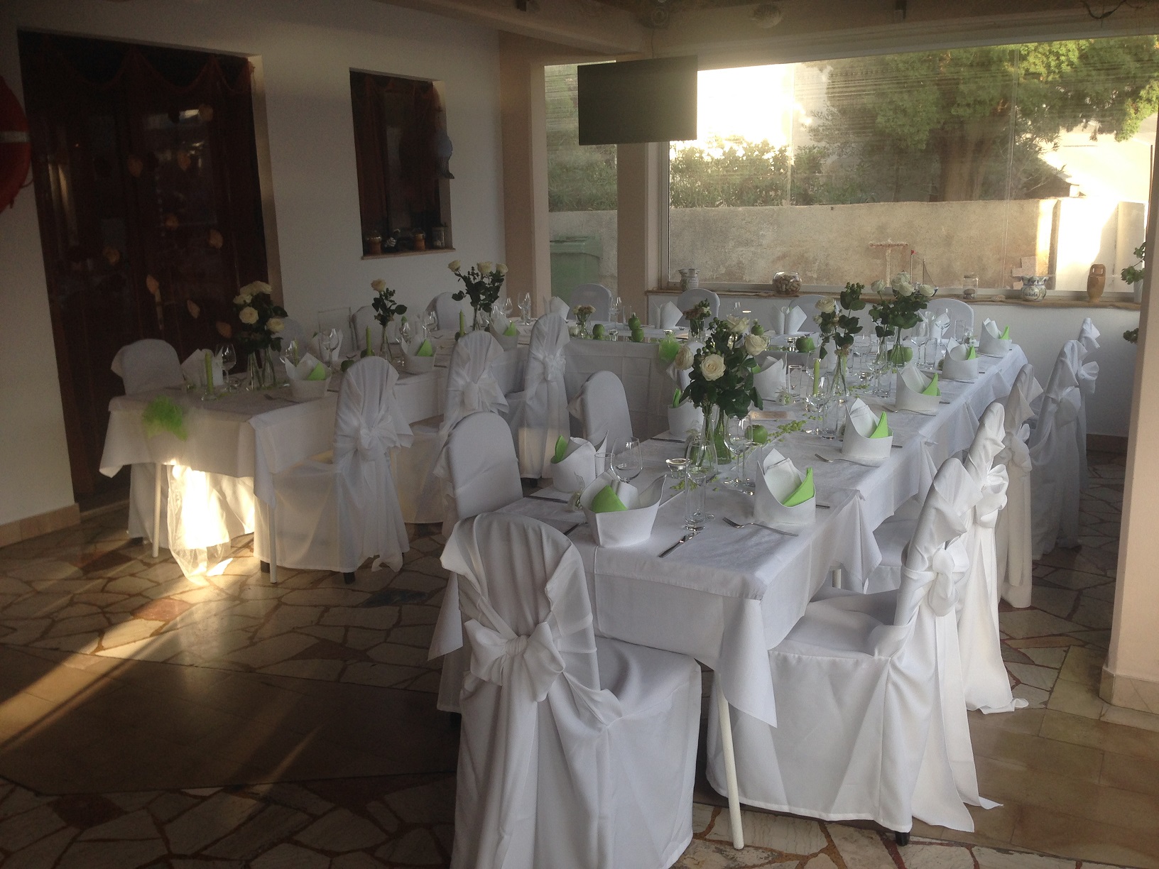 Abends lief das Boot im Hafen von Punat ein. Im Restaurant Divers-Best, der neue kulinarische Hotspot, empfing das frischgetraute Paar eine sehr schön dekorierte Tafel, und der Chef Nikola ließ es sich nicht nehmen alle persönlich zu begrüßen und Anja und Christian zu gratulieren.