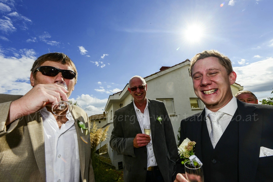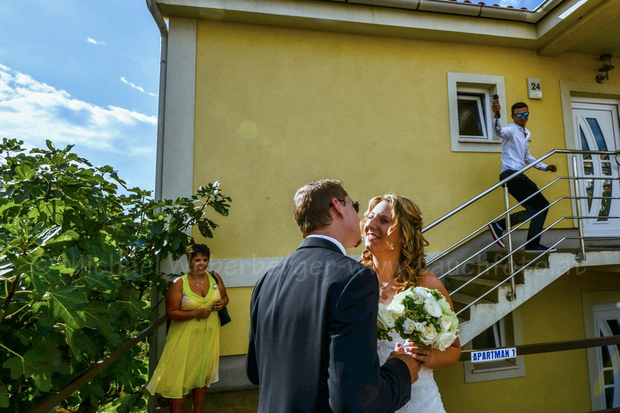 Am nächsten Morgen war dann der große Augenblick gekommen!! Nach einer sehr stürmischen Nacht mit unwetterartigen Regenschauern, schien die Sonne am Morgen wie bestellt. Noch schnell wurde der Brautstrauß vom Floristen geholt und somit stand dem Empfang der Braut nichts mehr im Weg. Wunderschön, ein Traum in Weiß, kam Anja, die Braut, aus ihrer Unterkunft und zauberte mühelos ein strahlendes Lächeln auf das Gesicht von Cristian, dem Bräutigam, und auch allen anderen Gästen. Musikalisch wurde der Auftritt von drei heimischen Musikanten untermalt.
